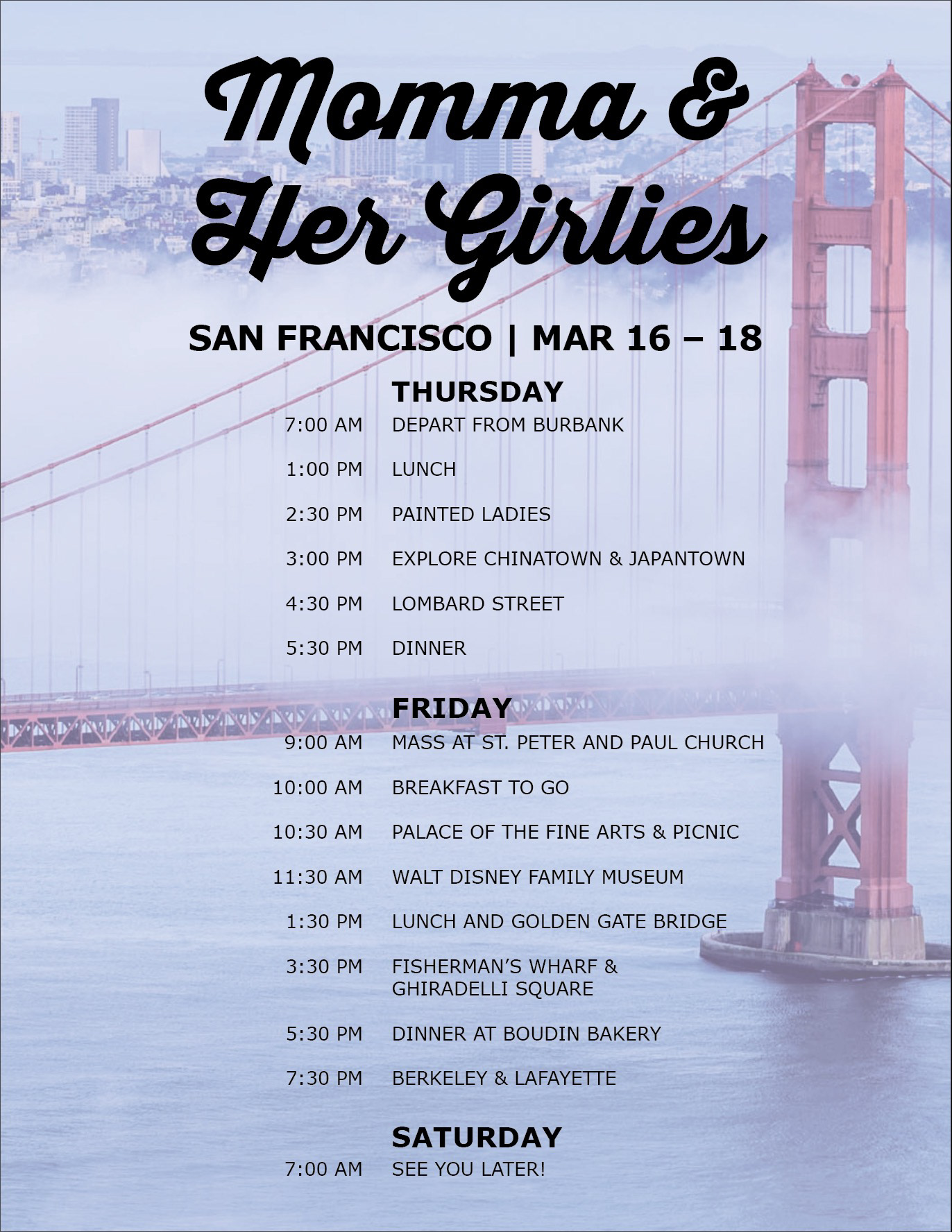 I DESIGNED THIS ITINERARY FOR AN OVERNIGHT GIRL'S TRIP AS A PERSONAL PROJECT AS A WAY TO CHALLENGE MYSELF FURTHER WITH OVERLAYS, LAYERS, AND OVERLAPPING ELEMENTS.