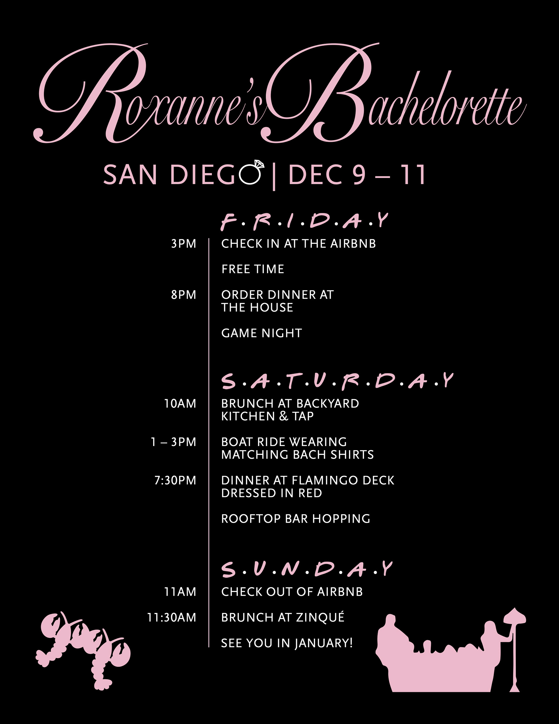 FOR A GIRL'S BACHELORETTE WEEKEND WHICH COMBINED THE THEMES OF "FRIENDS" AND BEYONCÉ'S "BEYONCÉ" ALBUM, I DESIGNED THIS ITINERARY. I ALSO DESIGNED THE CHOCOLATE WRAPPERS AND PACKAGED THE PARTY FAVORS. I ALSO MARKETED THE EVENT ON SOCIAL MEDIA WHICH GARNERED POSITIVE REACTIONS.